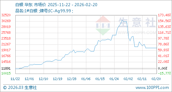 2月20日,生意社白銀基準價為19954.33元/千克,與本月初(30098.67元/千克)相比,下降了33.7%。