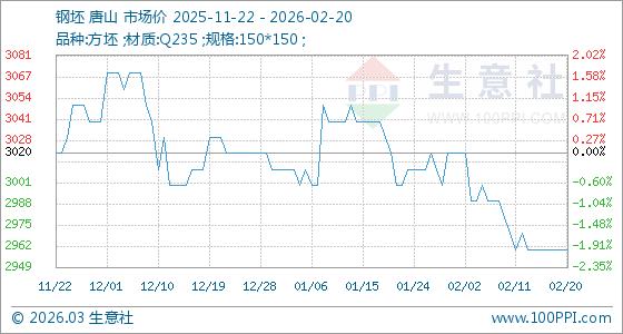 2月20日,生意社鋼坯基準價為2960.00元/噸,與本月初(3020.00元/噸)相比,下降了1.99%。