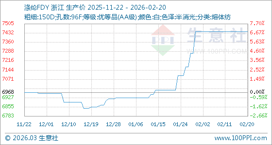 2月20日,生意社滌綸FDY基準(zhǔn)價(jià)為7445.00元/噸,與本月初持平。