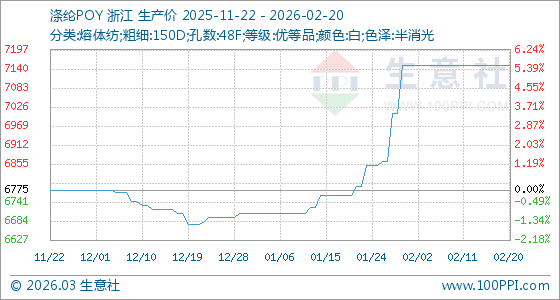 2月20日,生意社滌綸POY基準(zhǔn)價(jià)為7150.00元/噸,與本月初持平。