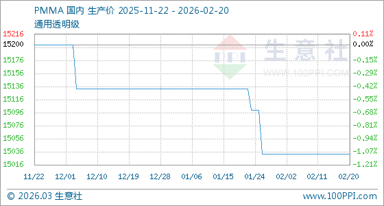 2月20日,生意社PMMA基準價為15033.33元/噸,與本月初持平。