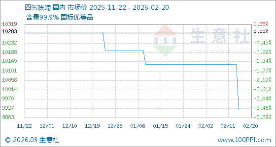 2月20日,生意社四氫呋喃基準(zhǔn)價(jià)為9920.00元/噸,與本月初(10133.33元/噸)相比,下降了2.11%。