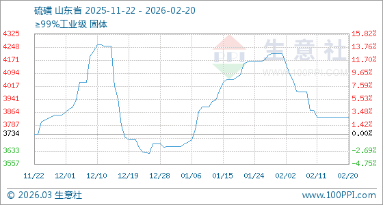 2月20日,生意社硫磺基準價為3833.33元/噸,與本月初(4210.00元/噸)相比,下降了8.95%。