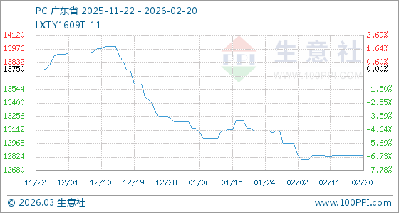 2月20日,生意社PC基準(zhǔn)價(jià)為12836.67元/噸,與本月初(12966.67元/噸)相比,下降了1%。