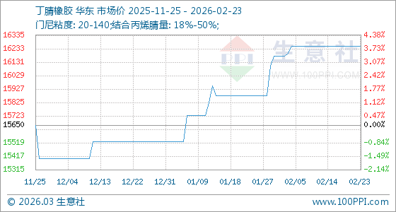 2月23日,生意社丁腈橡膠基準(zhǔn)價(jià)為16250.00元/噸,與本月初(16175.00元/噸)相比,上漲了0.46%。