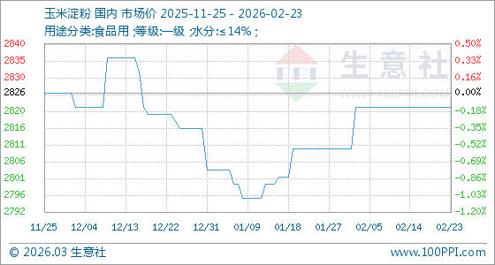 2月23日,生意社玉米淀粉基準價為2822.00元/噸,與本月初(2810.00元/噸)相比,上漲了0.43%。