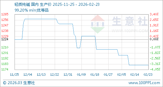 2月23日,生意社輕質(zhì)純堿基準(zhǔn)價(jià)為1182.00元/噸,與本月初(1208.00元/噸)相比,下降了2.15%。
