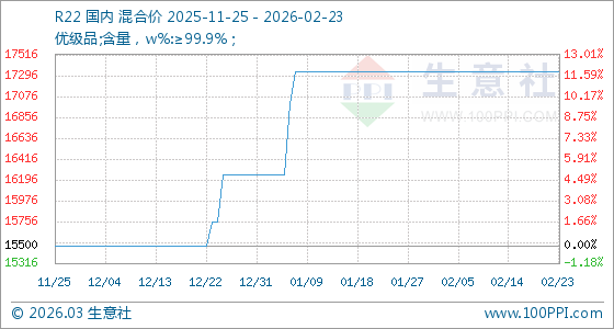 2月23日,生意社R22基準(zhǔn)價為17333.33元/噸,與本月初持平。