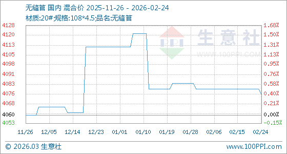 2月24日,生意社無縫管基準(zhǔn)價(jià)為4080.00元/噸,與本月初持平。