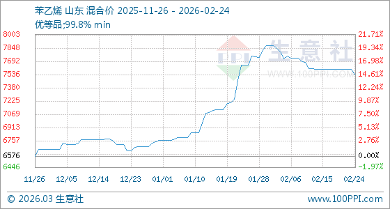 2月24日,生意社苯乙烯基準(zhǔn)價(jià)為7594.00元/噸,與本月初(7874.00元/噸)相比,下降了3.56%。