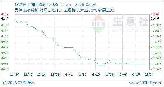 2月24日,生意社鍍鋅板基準價為4052.50元/噸,與本月初(4055.00元/噸)相比,下降了0.06%。