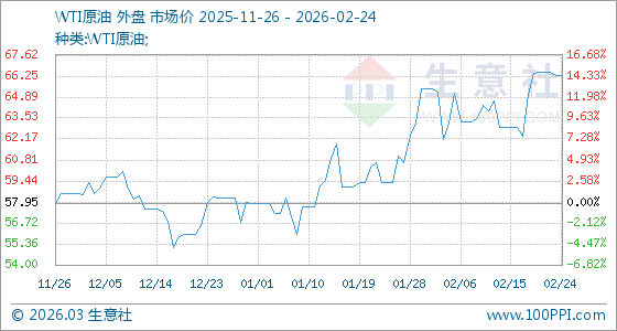 2月24日,生意社WTI原油基準(zhǔn)價(jià)為62.84美元/桶,與本月初(65.42美元/桶)相比,下降了3.94%。
