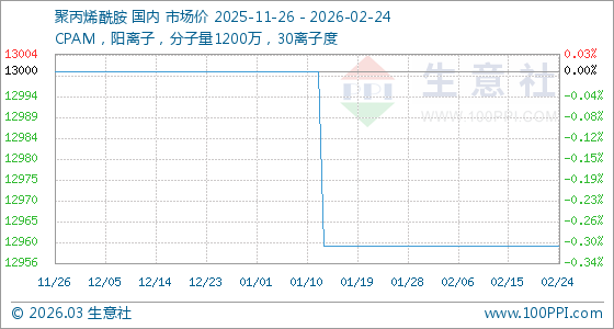 2月24日,生意社聚丙烯酰胺基準(zhǔn)價(jià)為12960.00元/噸,與本月初持平。