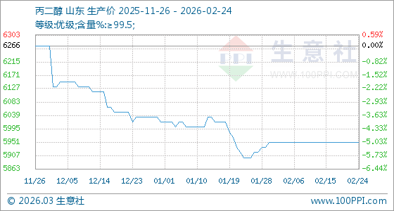 2月24日,生意社丙二醇基準(zhǔn)價為5950.00元/噸,與本月初持平。