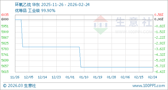 2月24日,生意社環(huán)氧乙烷基準(zhǔn)價(jià)為5650.00元/噸,與本月初持平。