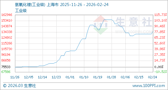 2月24日,生意社氫氧化鋰(工業(yè)級)基準(zhǔn)價為131000.00元/噸,與本月初(148000.00元/噸)相比,下降了11.49%。