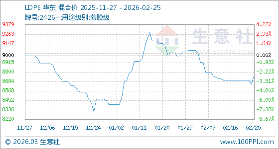 2月25日,生意社LDPE基準價為8650.00元/噸,與本月初(9066.67元/噸)相比,下降了4.6%。