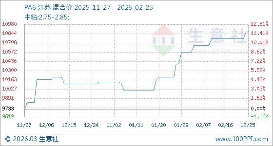 2月25日,生意社PA6基準價為10866.67元/噸,與本月初(10566.67元/噸)相比,上漲了2.84%。