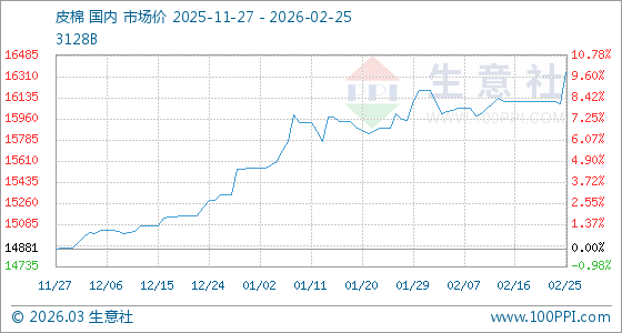 2月25日,生意社皮棉基準(zhǔn)價(jià)為16087.33元/噸,與本月初(16196.50元/噸)相比,下降了0.67%。