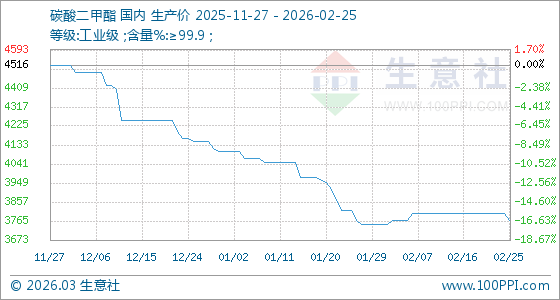 2月25日,生意社碳酸二甲酯基準價為3800.00元/噸,與本月初(3750.00元/噸)相比,上漲了1.33%。