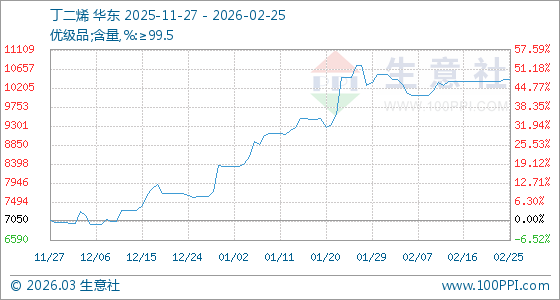 2月25日,生意社丁二烯基準(zhǔn)價為10400.00元/噸,與本月初(10533.33元/噸)相比,下降了1.27%。