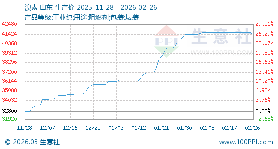 2月26日,生意社溴素基準價為41600.00元/噸,與本月初(41400.00元/噸)相比,上漲了0.48%。