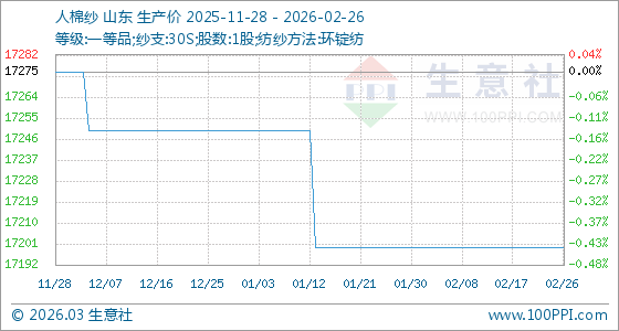 2月26日,生意社人棉紗基準(zhǔn)價(jià)為17200.00元/噸,與本月初持平。