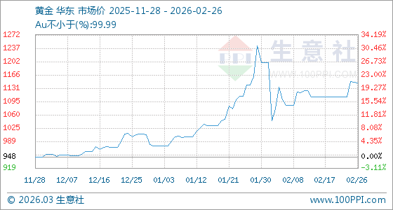 2月26日,生意社黃金基準(zhǔn)價為1147.14元/克,與本月初(1199.84元/克)相比,下降了4.39%。