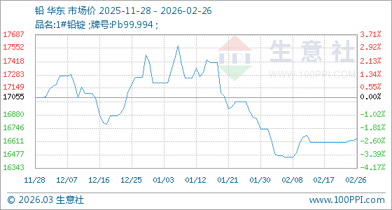 2月26日,生意社鉛基準價為16620.00元/噸,與本月初(16735.00元/噸)相比,下降了0.69%。