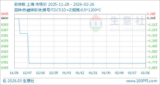 2月26日,生意社彩涂板基準(zhǔn)價(jià)為6350.00元/噸,與本月初持平。