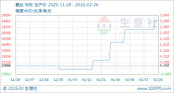 2月26日,生意社氨綸基準(zhǔn)價(jià)為24500.00元/噸,與本月初(24100.00元/噸)相比,上漲了1.66%。