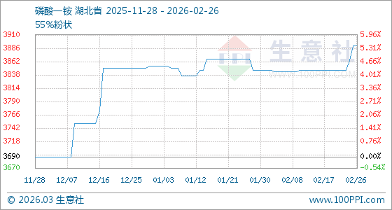 2月26日,生意社磷酸一銨基準(zhǔn)價(jià)為3890.00元/噸,與本月初(3846.67元/噸)相比,上漲了1.13%。