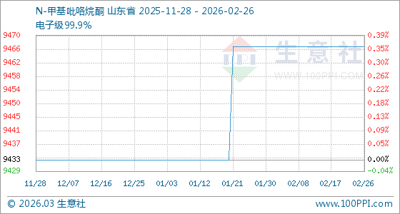 2月26日,生意社N-甲基吡咯烷酮基準(zhǔn)價為9466.67元/噸,與本月初持平。