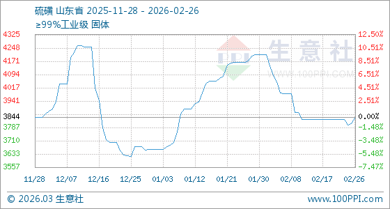2月26日,生意社硫磺基準(zhǔn)價為3810.00元/噸,與本月初(4210.00元/噸)相比,下降了9.5%。
