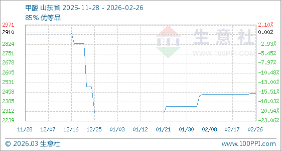 2月26日,生意社甲酸基準(zhǔn)價(jià)為2450.00元/噸,與本月初(2350.00元/噸)相比,上漲了4.26%。