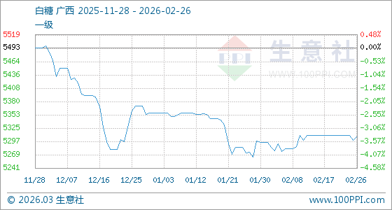 2月26日,生意社白糖基準(zhǔn)價為5300.00元/噸,與本月初(5295.00元/噸)相比,上漲了0.09%。