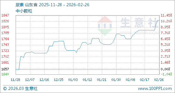 2月26日,生意社尿素基準(zhǔn)價(jià)為1830.00元/噸,與本月初(1782.50元/噸)相比,上漲了2.66%。