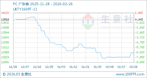 2月26日,生意社PC基準(zhǔn)價(jià)為12960.00元/噸,與本月初(12966.67元/噸)相比,下降了0.05%。