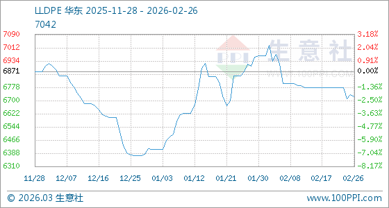 2月26日,生意社LLDPE基準(zhǔn)價(jià)為6736.66元/噸,與本月初(6966.67元/噸)相比,下降了3.3%。