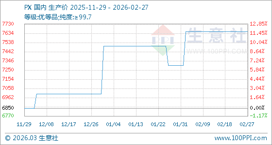 2月27日,生意社PX基準價為7650.00元/噸,與本月初(7300.00元/噸)相比,上漲了4.79%。