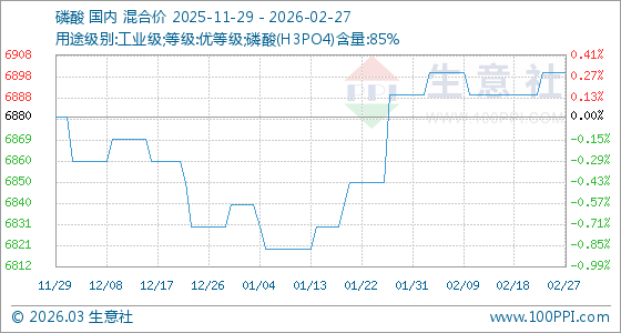2月27日,生意社磷酸基準(zhǔn)價(jià)為6900.00元/噸,與本月初(6890.00元/噸)相比,上漲了0.15%。