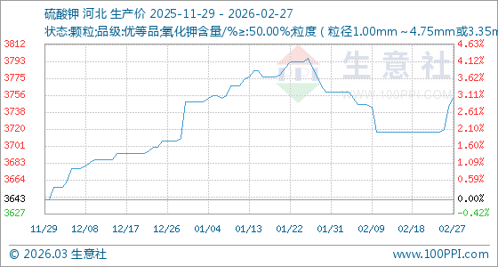 2月27日,生意社硫酸鉀基準(zhǔn)價為3743.33元/噸,與本月初(3760.00元/噸)相比,下降了0.44%。