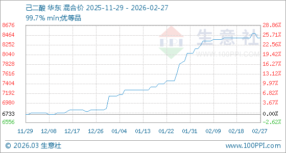 2月27日,生意社己二酸基準(zhǔn)價(jià)為8400.00元/噸,與本月初(8066.67元/噸)相比,上漲了4.13%。