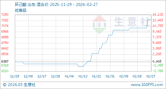 2月27日,生意社環(huán)己酮基準價為7200.00元/噸,與本月初(6900.00元/噸)相比,上漲了4.35%。