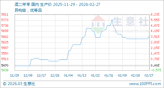 2月27日,生意社混二甲苯基準(zhǔn)價(jià)為5650.00元/噸,與本月初(5740.00元/噸)相比,下降了1.57%。