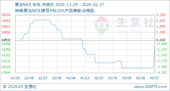 2月27日,生意社聚合MDI基準(zhǔn)價(jià)為14000.00元/噸,與本月初(14100.00元/噸)相比,下降了0.71%。