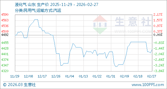 2月27日,生意社液化氣基準(zhǔn)價為4407.50元/噸,與本月初(4412.50元/噸)相比,下降了0.11%。