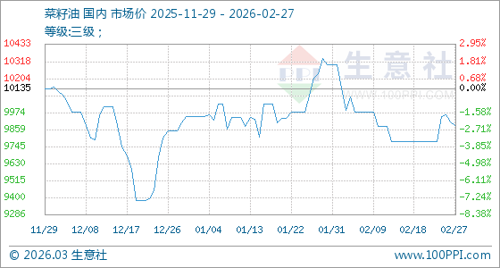 2月27日,生意社菜籽油基準(zhǔn)價(jià)為9910.00元/噸,與本月初(10298.00元/噸)相比,下降了3.77%。