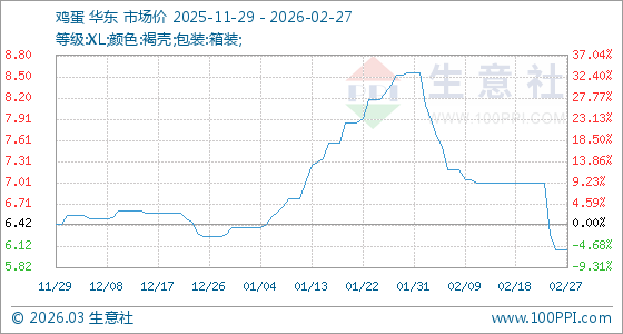 2月27日,生意社雞蛋基準(zhǔn)價(jià)為6.07元/公斤,與本月初(8.55元/公斤)相比,下降了29.01%。