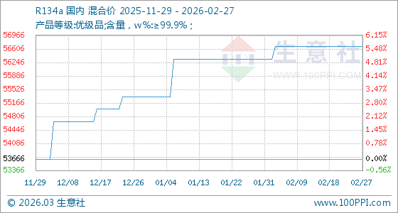 2月27日,生意社R134a基準(zhǔn)價(jià)為56666.67元/噸,與本月初(56333.33元/噸)相比,上漲了0.59%。